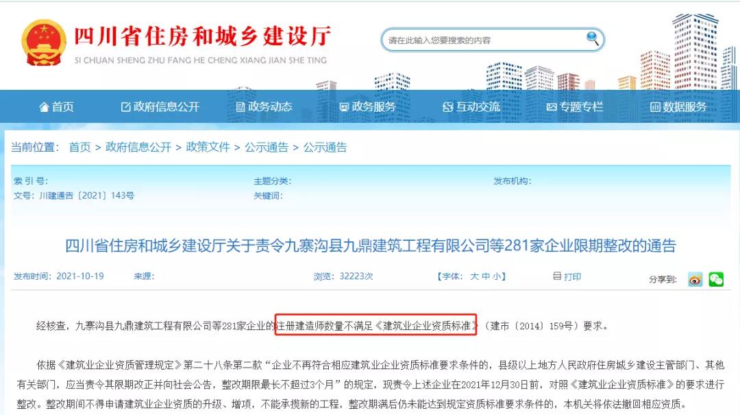 10月19日,四川省住房和城鄉建設廳發布通告,責令九寨溝縣九鼎建筑工程有限公司等281家企業限期整改。