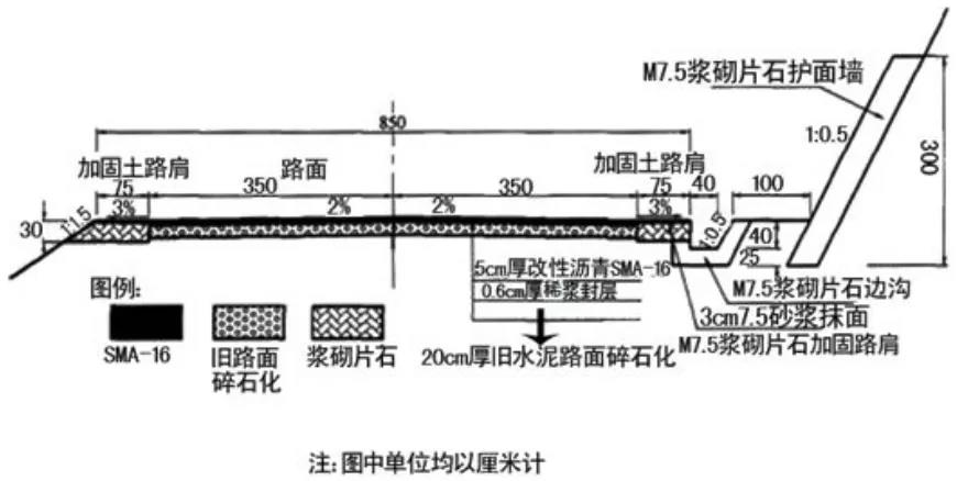 某施工單位承接了長35.8km的二級公路舊路面“白改黑”改建施工,舊路面為水泥混凝土面層,使用10年后面板損壞嚴重,必須重建。經設計院按舊路改建設計后,將舊路面做碎石化處理,加鋪SMA面層。在右側巖層破碎的挖方路段增設碎落臺和護面墻。路面結構如下圖所示。