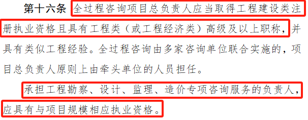 承擔工程勘察、設計、監(jiān)理、造價等專項咨詢服務的負責人,應具有與項目規(guī)模相應執(zhí)業(yè)資格。