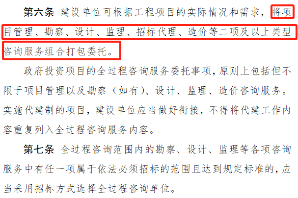 建設單位可根據工程項目的實際情況和需求,將項目管理以及勘察、設計、監(jiān)理、招標代理、造價等咨詢服務全部或部分打包委托。