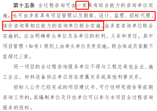 全過程咨詢可由一家具有綜合能力的咨詢單位實施,也可由多家分別具有項目管理以及勘察、設計、監(jiān)理、招標代理、造價咨詢等相應能力的咨詢單位聯合實施。聯合體成員家數不宜超過三家。