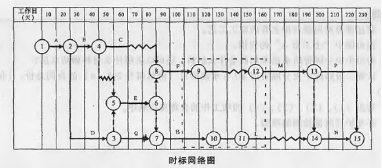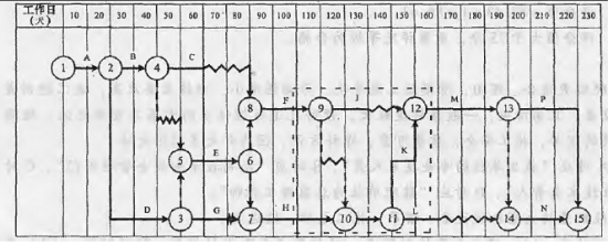 (2)關(guān)鍵線路為:①→②→③→⑤→⑥→⑦→⑩→?→?→?→?和 ①→②→③→⑤→⑥→⑦→⑩→?→?→?→?→? ??偣て跒?20 天。
