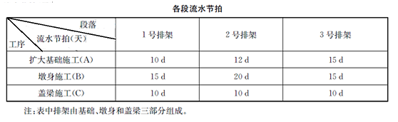 某施工單位承接了一4×20m簡(jiǎn)支梁橋工程。橋梁采用擴(kuò)大基礎(chǔ),墩身平均高10m。項(xiàng)目為單價(jià)合同,且全部鋼筋由業(yè)主提供,其余材料由施工單位自采或自購(gòu)。在離本工程不遠(yuǎn)的江邊有豐富的砂源,經(jīng)檢驗(yàn),砂的質(zhì)量符合要求。采砂點(diǎn)位于一跨江大橋下游150m處,施工用砂均取自這里。項(xiàng)目部擬就1~3排架組織流水施工,如下表所示。