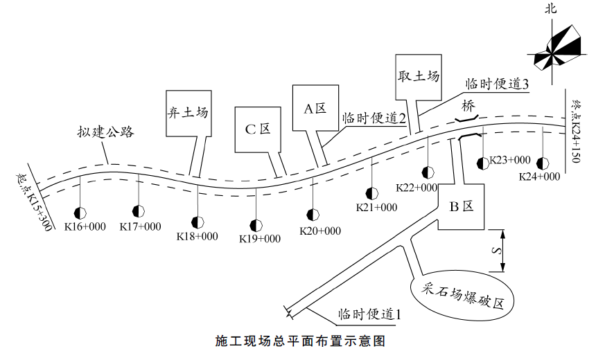 施工現場總平面布置示意圖如下圖所示,現場需在A、B、C三個區域分別布置橋梁梁板預制場(含水泥混凝土拌和站)、水泥穩定土拌和站和承包人駐地三種臨時工程。