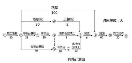 某施工單位承接了某公路項目施工,工程內容含路基、路面及橋梁一座,合同工期220天。根據合同約定,土方工程實際完成最超過清單數量的25%之后,超出部分的土方工程單價由清單報價的20元/立方米下調為18元/立方米。按投標書附錄規定,受價格上漲影響,人工、水泥和鋼材按調值公式調價。該工程的人工費占全合同價的35%,水泥費用占25%,鋼材費用占10%。合同簽訂后,項目部編制了施工組織設計,安排路基工程與橋梁工程平行施工;路基工程、路面工程分別組織順序施工,由于施工橋臺的鋼模板只有一套,南、北橋臺亦組織順序施工。經監理工程師審查批準的網絡計劃見下圖。征得業主同意,施工單位將橋臺基礎工程分包給了某基礎工程專業公司。