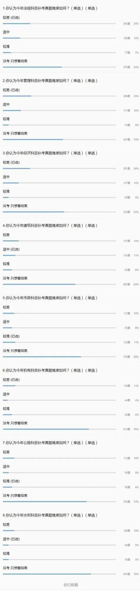 | 市政 | 選擇題簡單的題都不需要看完,就能選;難的都不知道在問啥。案例答得一臉懵逼,計算題也比去年多!整體難度適中。 |