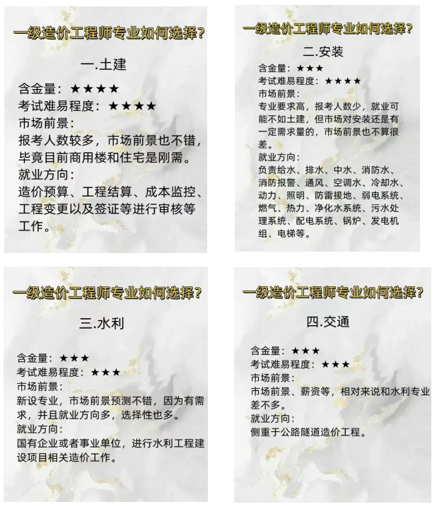 一造的專業分為土木建筑工程、交通運輸工程、水利工程和安裝工程4個專業類別,考生在報名時可以根據實際工作需要選擇一個專業進行報考。