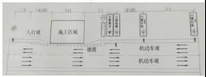 基坑臨近城市次干路,圍擋施工占用部分現況道路,項目部編制了交通導行圖(圖1)。在路邊按要求設置了A區、上游過渡區、B區、作業區、下游過渡區、C區*個區段,配備了交通導行標志、防護設施、夜間警示信號。