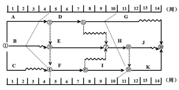 94.某工程項目的雙代號時標(biāo)網(wǎng)絡(luò)計劃圖,當(dāng)計劃執(zhí)行到第 4 周末及第 10 周末時,檢查得出實際進(jìn)度前鋒線如下圖所示,檢查結(jié)果表明()。