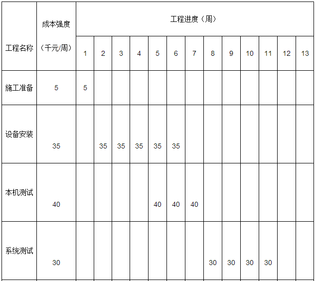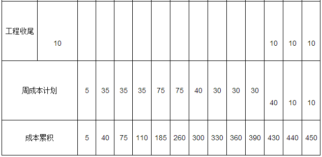 1、根據橫道圖用直方圖形式繪制,按周編制成本計劃 答:根據進度計劃橫道圖,繪制進度計劃成本矩陣見下表: