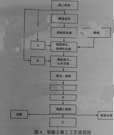 4.指出“混凝土施工工藝流程圖”中A、B、C、D、E分別代表的工序名稱。