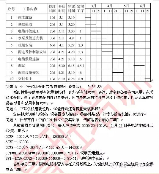 事件2:在熱水管道施工中,按施工圖設(shè)計位置施工,碰到其他管線,使熱水管道施工受阻,項目部向設(shè)計單位提出設(shè)計變更,要求改變熱水管道的走向,結(jié)果使水泵及管道安裝工作拖延到4月29日才完成。
