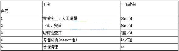 (1)挖土5d后開始下管、安管工作;(2)下管、安管200m后砌筑檢查井;(3)檢查井砌筑后,按四個井段為一組(200m)對溝槽回填。