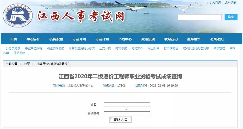 江西省2020年二級造價工程師職業資格考試成績可以查詢了!
