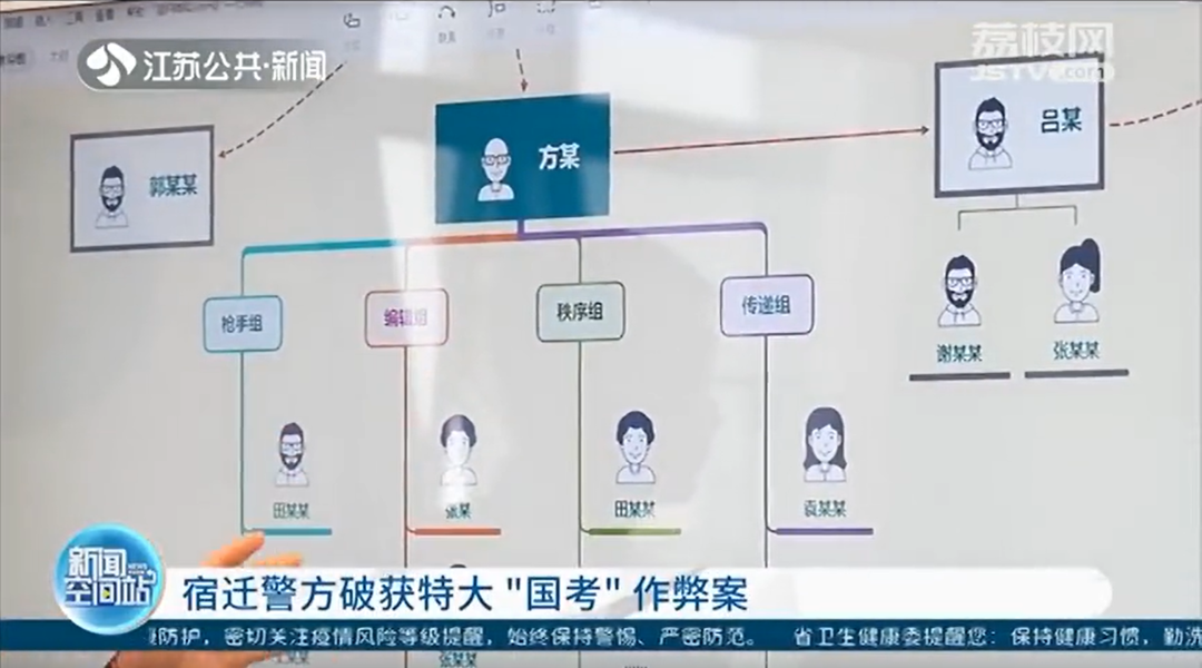 宿遷市公安局網安支隊案件偵查大隊大隊長王強軍介紹, 本案總共抓獲了34人,摧毀了犯罪團伙是8個,涉及到全國各地作弊的考生有2000多人。