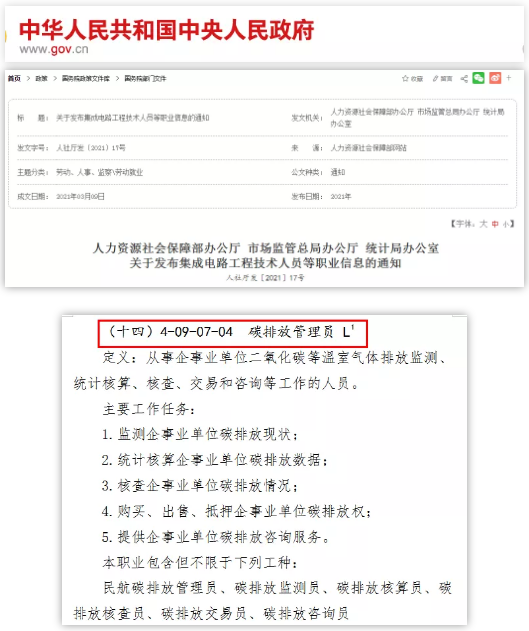 (3) 且在2021年3月,人社部、國家市場監(jiān)管總局、國家統(tǒng)計局發(fā)布了 18 項新職業(yè),"碳排放管理員" 被列入國家職業(yè)序列,并在該職業(yè)下設置了:“民航碳排放管理員”、“碳排放監(jiān)測員”、“碳排放核算員”、“碳排放核查員”、“碳排放交易員”、“碳排放咨詢員”6個工種。通知如下: