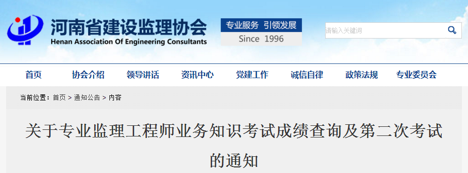 11月18日舉行的專業(yè)監(jiān)理工程師業(yè)務知識考試,成績今日公布。請參加考試的學員登陸協(xié)會網站,在“河南省建設監(jiān)理從業(yè)人員教育培訓系統(tǒng)”里查詢成績,合格標準是105分。