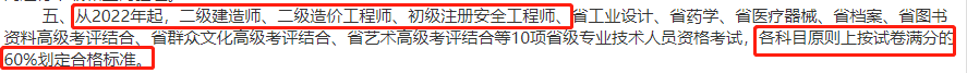 五、從2022年起,二級建造師、二級造價工程師、初級注冊安全工程師、省工業設計、省藥學、省醫療器械、省檔案、省圖書資料高級考評結合、省群眾文化高級考評結合、省藝術高級考評結合等10項省級專業技術人員資格考試,各科目原則上按試卷滿分的60%劃定合格標準。