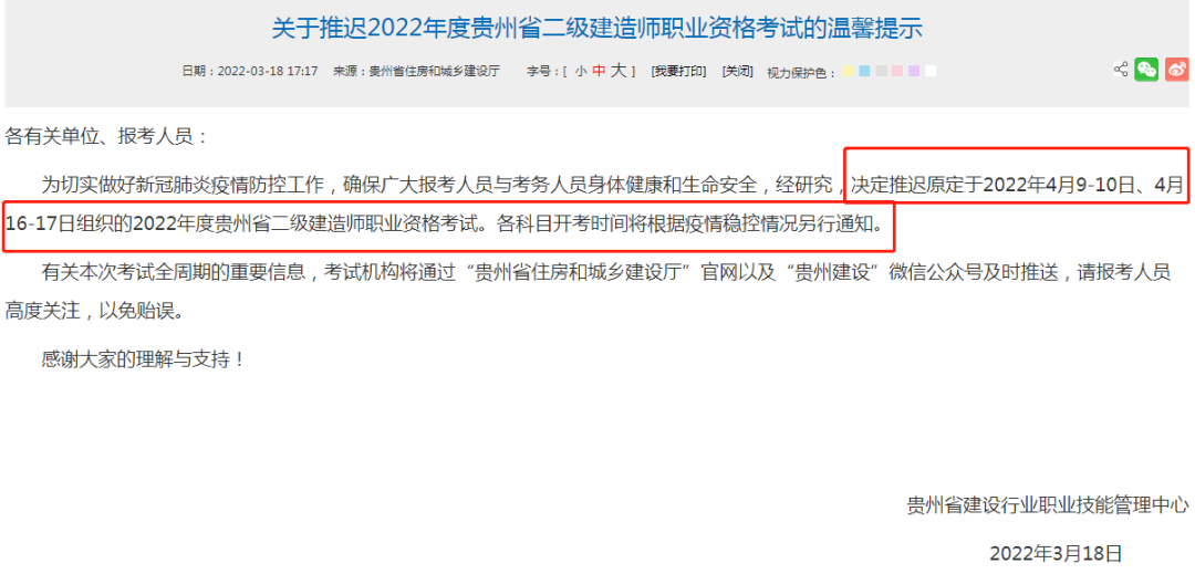 關于推遲2022年度貴州省二級建造師職業資格考試的溫馨提示