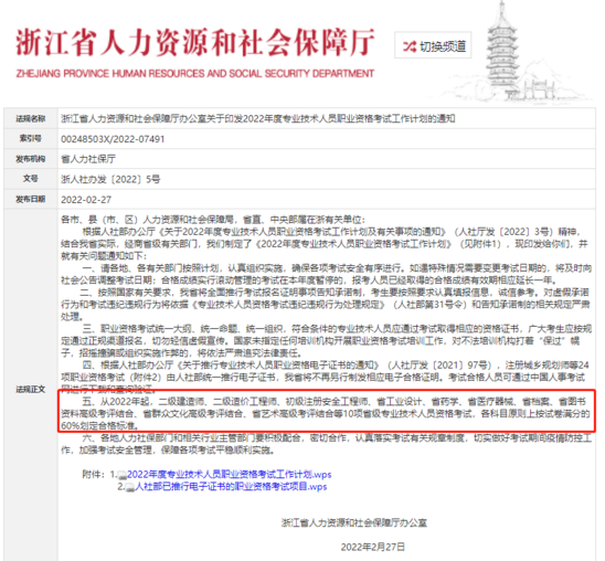 浙江省人社廳發(fā)文:自2022年起,二建各科目原則上按試卷滿分的60%劃定合格標(biāo)準(zhǔn)。