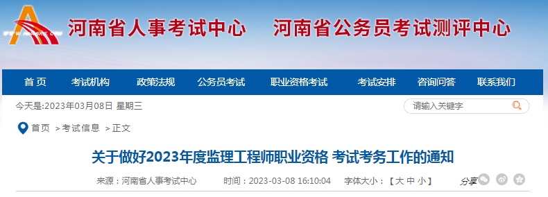為做好我省2023年度監理工程師職業資格考試考務工作,根據《人力資源社會保障部辦公廳關于2023年度專業技術人員職業資格考試計劃及有關事項的通知》(人社廳發〔2023〕3號)和人力資源社會保障部人事考試中心《關于2023年度監理工程師職業資格考試考務工作的通知》(人考中心函〔2023〕17號)精神,現將有關事項通知如下:
