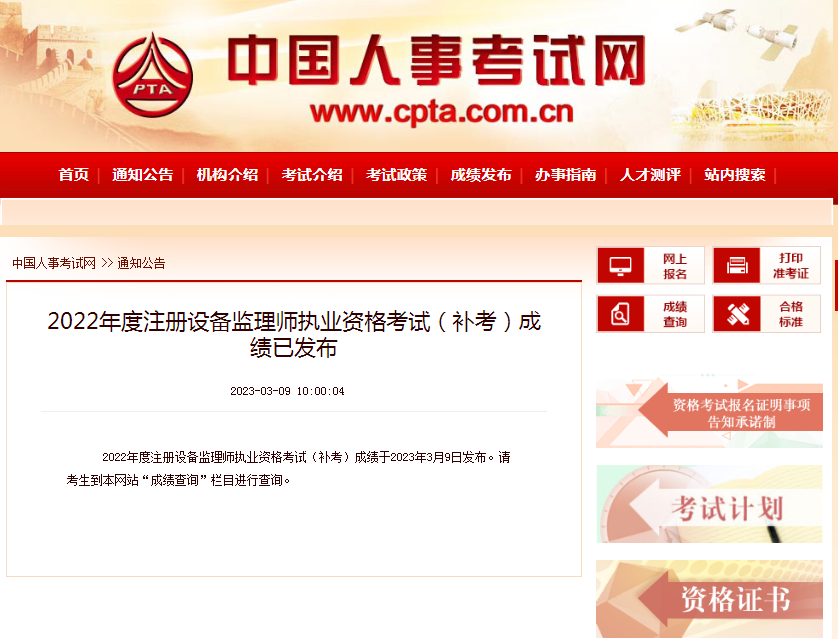 2022年度注冊設(shè)備監(jiān)理師執(zhí)業(yè)資格考試(補考)成績于2023年3月9日發(fā)布。請考生到中國人事考試網(wǎng)(http://www.cpta.com.cn/index.html)“成績查詢”欄目進(jìn)行查詢。