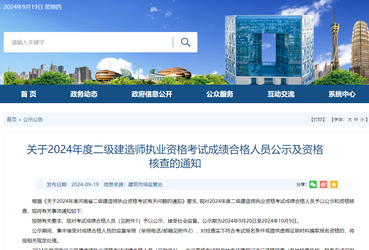 根據《關于2024年度河南省二級建造師執業資格考試有關問題的通知》要求, 現對2024年度二級建造師執業資格考試成績合格人員予以公示和資格核查,現將有關事項通知如下: