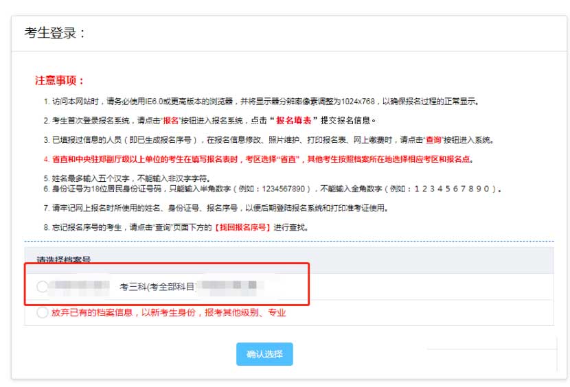 新考生(第一次參加考試的考生):不會出現(xiàn)檔案號 會直接開始下一步老考生(之前參加過考試的考生):會現(xiàn)檔案號 選擇檔案號進(jìn)行報名