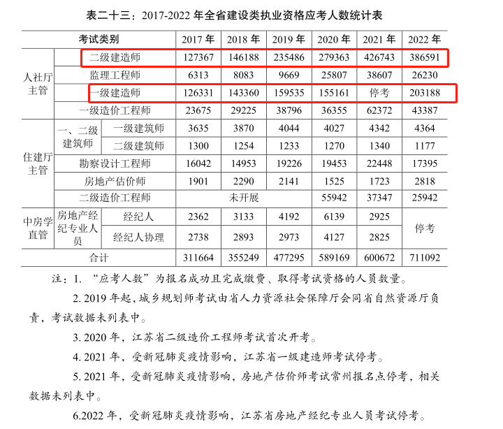 近日江蘇省住建廳發布了《2022年度建筑業發展報告》,內容很多,值得大家關注的是“執業資格考試人員”這一篇章,公布了22年度建筑業資格考試人數,以及官網公布的考過人數,可得出的22年度對應考證通過率。