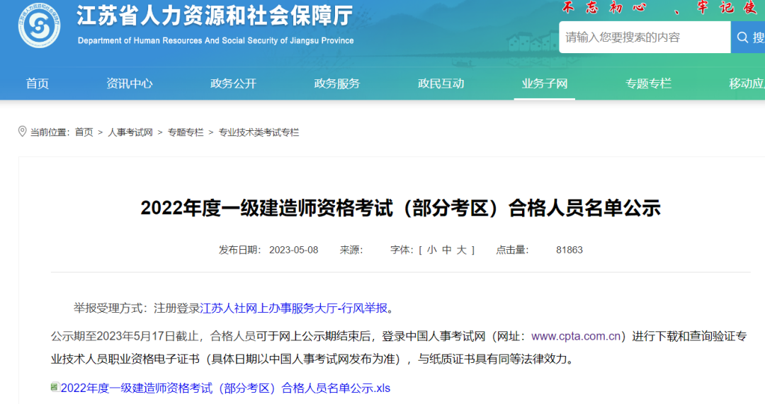 根據江蘇人社廳發布的合格人員名單公示,2022年江蘇省一級建造師資格考試合格人數為 18339 人。