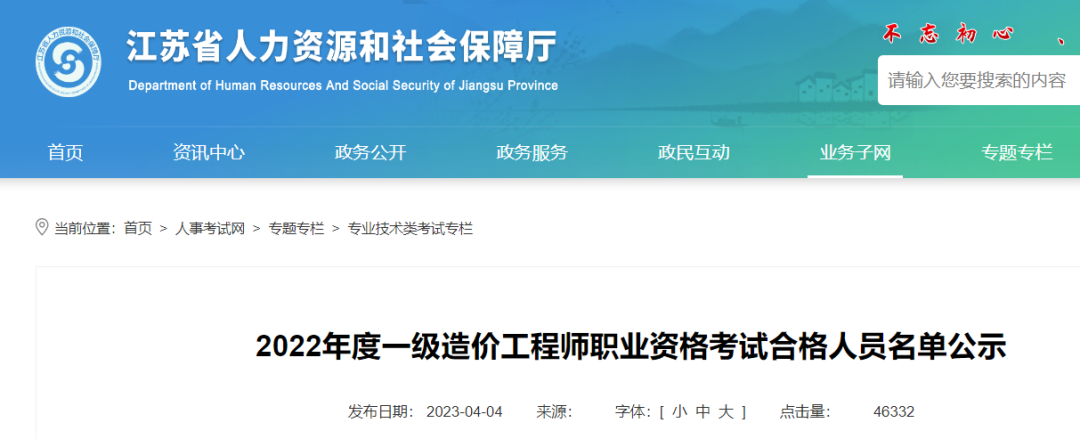 根據江蘇人社廳發布的合格人員名單公示,2022年江蘇省一級級造價工程師資格考試合格人數為 4696 人。