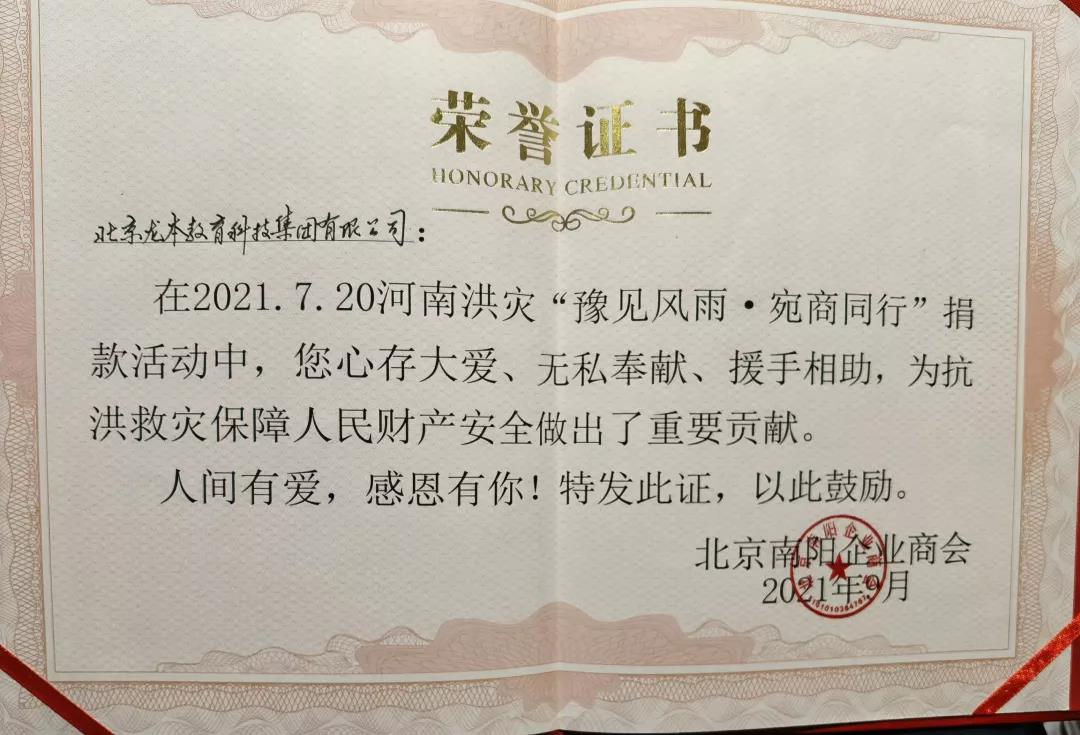 在7.20洪災捐款活動中,龍本魯班被授予并頒發榮