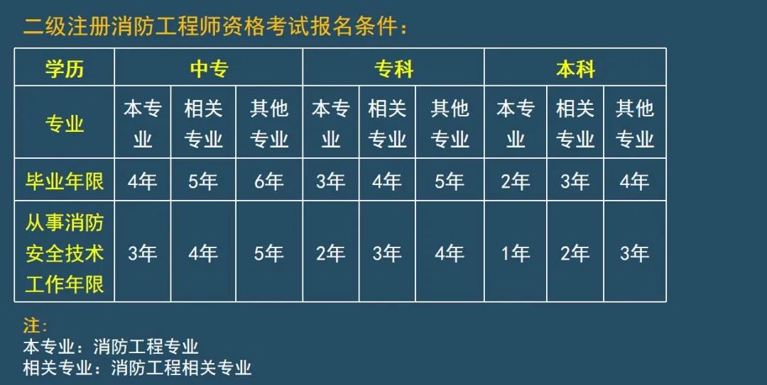 (二)取得消防工程專業大學專科學歷,從事消防安全技術工作滿2年;或者取得消防工程相關專業大學專科學歷,從事消防安全技術工作滿3年。