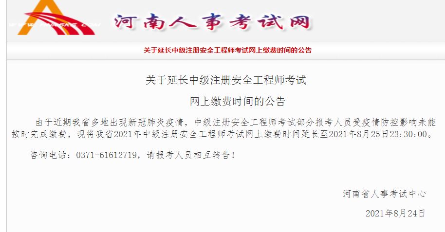 2021年中級(jí)注冊(cè)安全工程師考試網(wǎng)上繳費(fèi)時(shí)間延長(zhǎng)