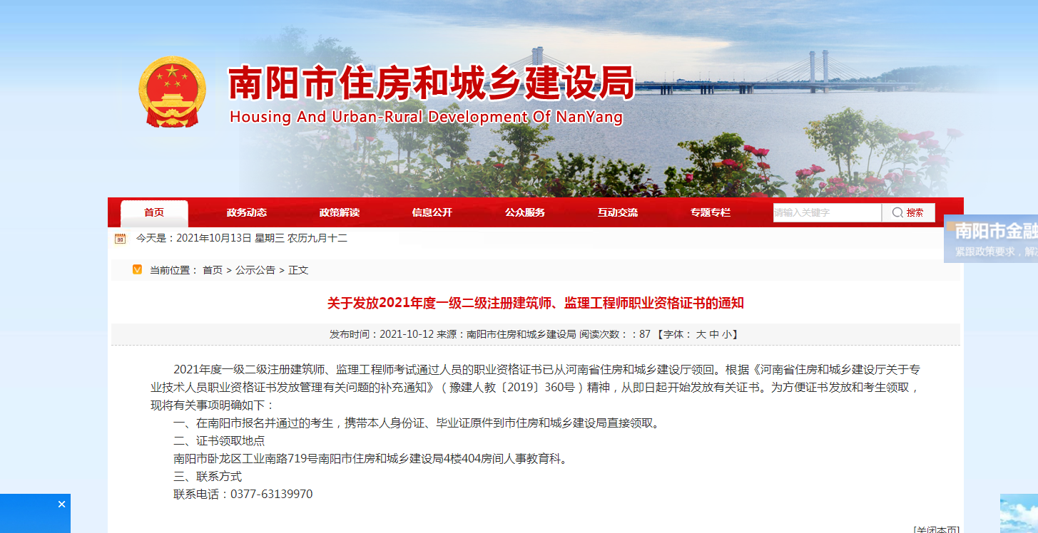 10月12日,南陽住房和城鄉建設局官網發布了《關于發放2021年度一級二級注冊建筑師、監理工程師職業資格證書的通知》,南陽市2021年度一級二級注冊建筑師、監理工程師考試通過人員的職業資格證書已從河南省住房和城鄉建設廳領回。根據《河南省住房和城鄉建設廳關于專業技術人員職業資格證書發放管理有關問題的補充通知》(豫建人教〔2019〕360號)精神,從即日(10月12日)起開始發放有關證書。為方便證書發放和考生領取,現將有關事項明確如下: