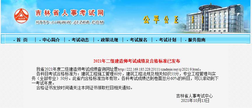 今日,吉林省發布通知《2021年二級建造師考試成績及合格標準已發布》。發布各科目考試合格標準為:建筑工程施工管理60分,建筑工程法規及相關知識55分,專業工程管理與實務(全部專業)50分。此省內合格標準當年有效。各科考試成績達到卷面總分60%的科目,可以滾動到下一考試年度。