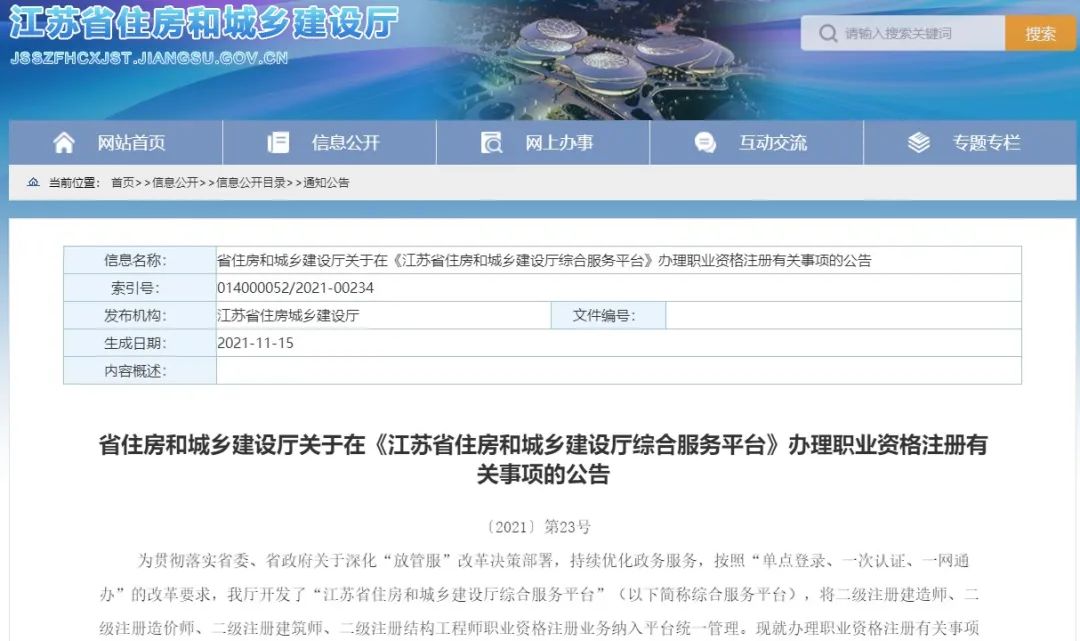 11月16日江蘇建設人才網刊登了《江蘇省住房和城鄉建設廳綜合服務平臺》辦理職業資格注冊有關事項的公告。