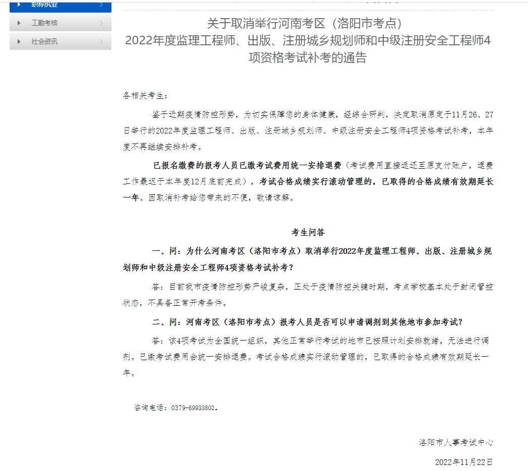 洛陽:取消2022年注安、監(jiān)理等4項(xiàng)考試補(bǔ)考!