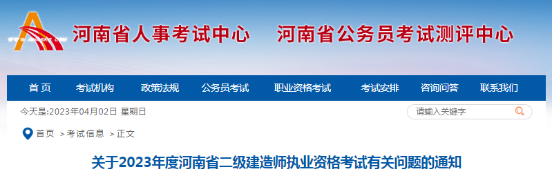 終于:河南人事考試網(wǎng)發(fā)布了2023年度河南省二級建造師執(zhí)業(yè)資格考試,內(nèi)容如下: