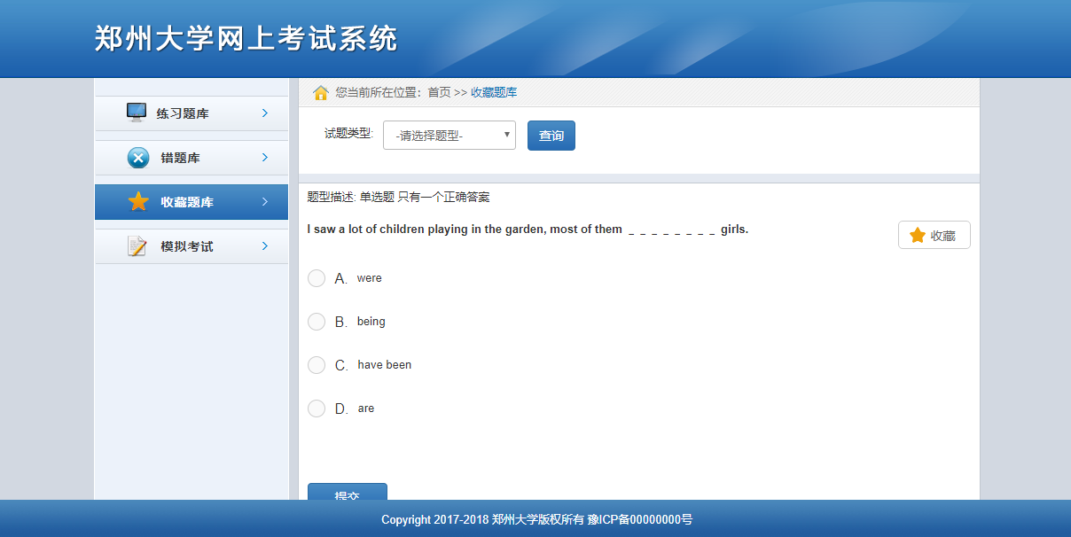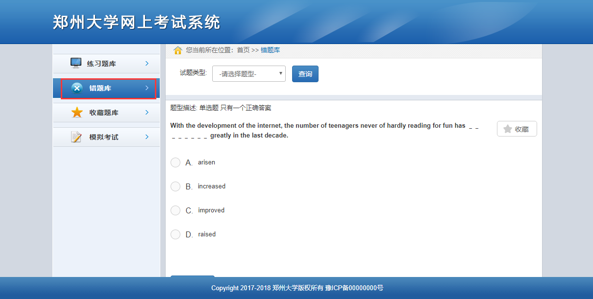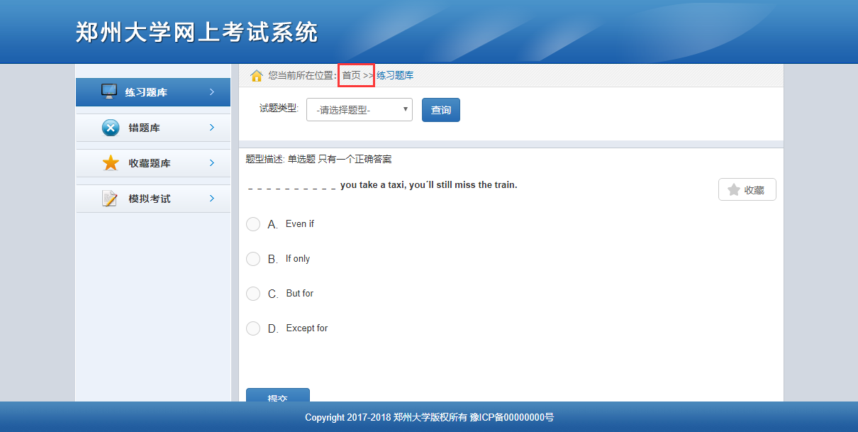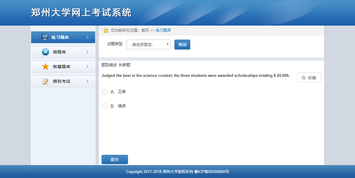 在線練習頁面主要包括“練習題庫”、“錯題庫”、“收藏題庫”和“模擬考試”四部分,如下圖所示: