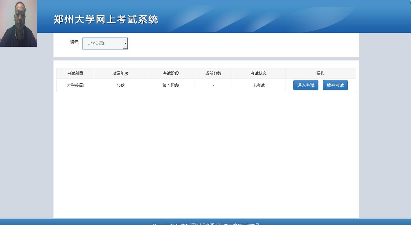 進入考試系統后,面部識別程序會全程監控考生行為,屏幕左上角為監控畫面。如果考試過程中出現異常情況(不是本人,多張人臉,沒有人)時,系統會給出相應提示,多次比對不通過的,系統會自動退出當前考試,本次考試作廢。如圖所示: