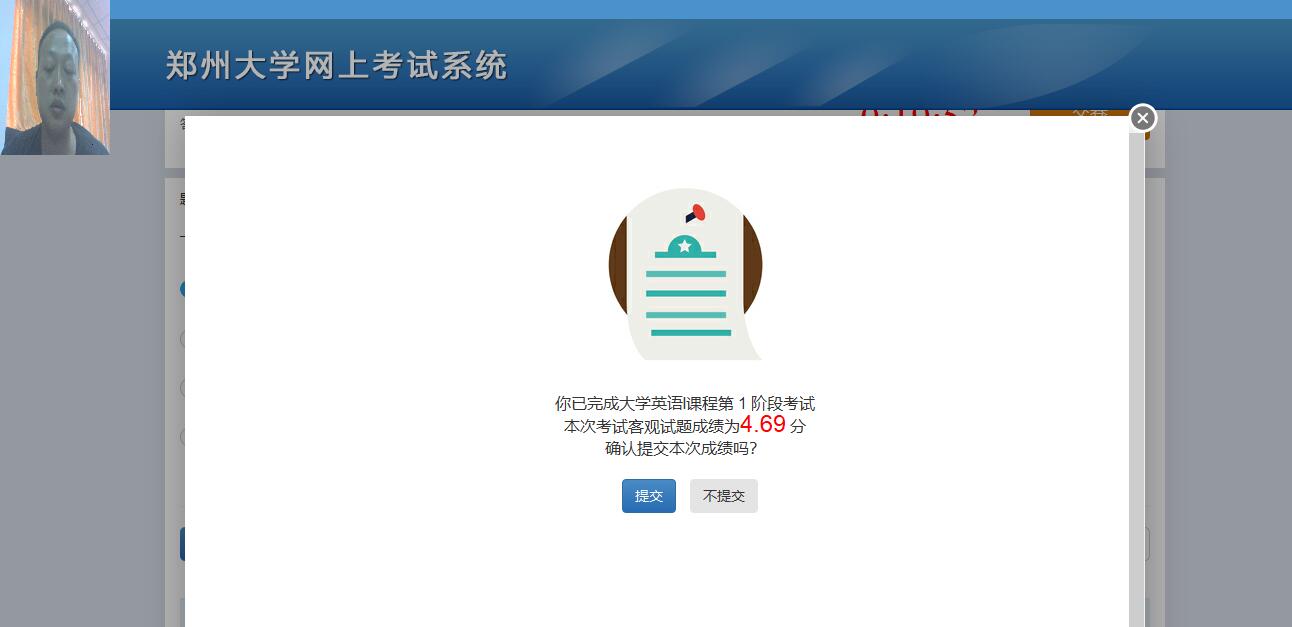 學生可根據分數情況確認是否提交本次成績,如對本次考試成績不滿意,可以不提交本次考試,可對該課程本階段再次進行考試,如提交成績該階段將無法再次進行考試,如下圖所示: