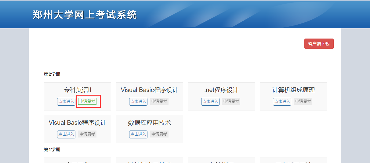 已考過該門課程所有階段的考試后,如果對本次考試成績不滿意,可在進入系統時的考試列表中點擊【申請復考】提交申請,交由管理員審核,通過后方可再次參加本門課程的網上考試。