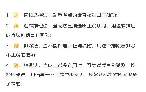 2,一定要選擇有把握的選項(xiàng),在沒有絕對把握的情況下最好不選;若對所有選項(xiàng)都沒有把握時(shí),可用猜測法選擇1項(xiàng),千萬別空著不選。