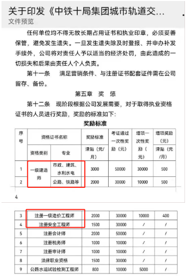 最近中鐵十局針對取得執業資格證書的人員進行獎勵,其中一級建造師、注冊一級造價工程師、注冊安全工程師均在獎勵范圍內,獎勵如下: