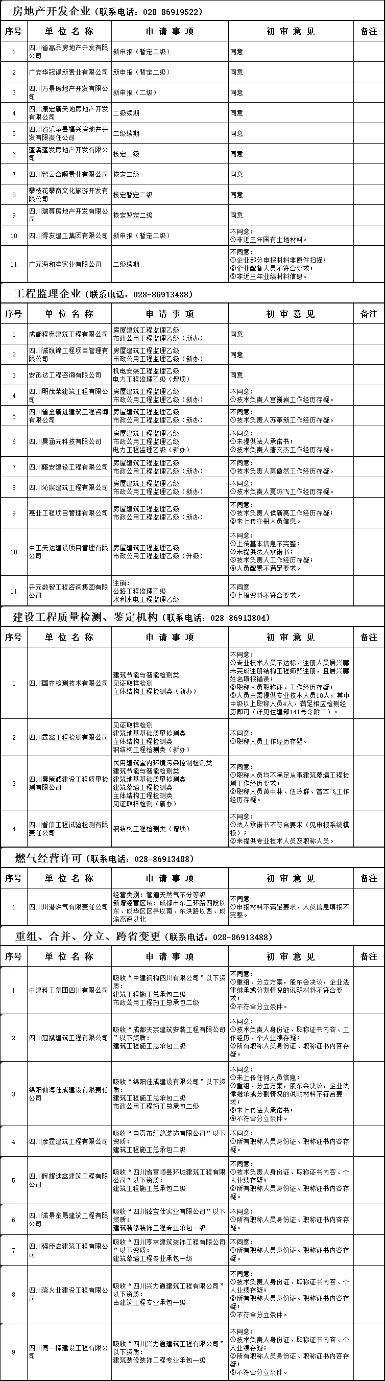 3月30日,四川省住建廳發布《關于建設類行政許可事項初審意見的公示》。根據相關規定,省住建廳對205家建設類行政許可申請人提交的相關材料進行審核,現公示初步審核意見: