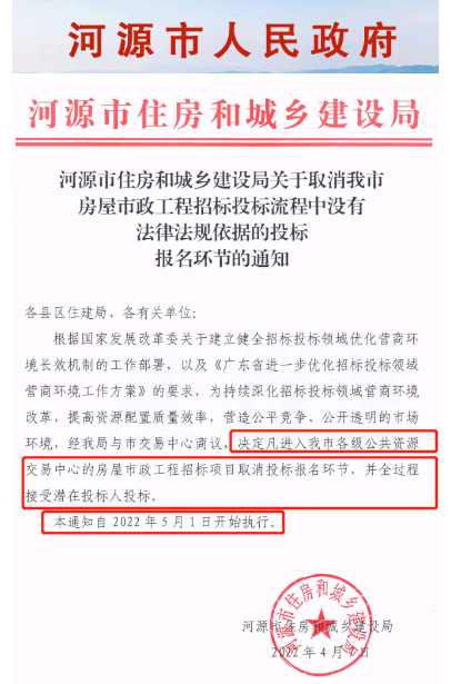 近日,河源市住建局發(fā)布了關(guān)于取消我市房屋市政工程招標(biāo)投標(biāo)流程中沒有法律法規(guī)依據(jù)的投標(biāo)報(bào)名環(huán)節(jié)的通知。5月1日起執(zhí)行。
