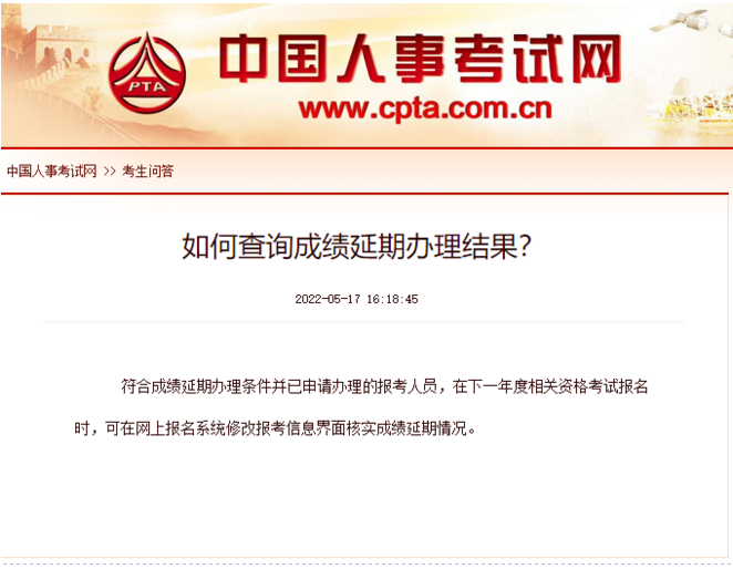 5月17日,中國人事考試網在“考生問答”回復如下:符合成績延期辦理條件并已申請辦理的報考人員,在下一年度相關資格考試報名時,可在網上報名系統修改報考信息界面核實成績延期情況。