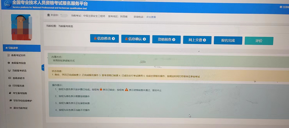 狀態信息需顯示:1.身份已完成核查;2.已完成報名操作;3.報考資格已核查;4.已成功支付考試費用;5.完成全部報名操作,按規定時間打印準考證參加考試。