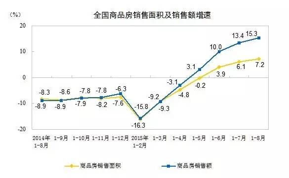 一是商品房銷售繼續回暖。1-8月份,全國商品房銷售面積同比增長7.2%,增速比1-7月份提高1.1個百分點;銷售額增長15.3%,增速提高1.9個百分點。而1-2月份商品房銷售面積和銷售額同比分別下降16.3%和15.8%。